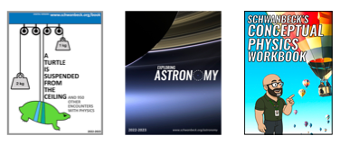 ![]() BOOKS I WROTE A Turtle Is Suspended From the Ceiling & 964 Other Encounters with Physics Affectionately(?) known by students as The Schwanbook, this 210 book contains a wide range of interesting practice problems, organized by topic and by type (practice, advanced, & conceptual.)